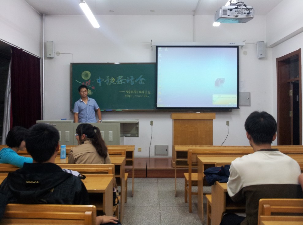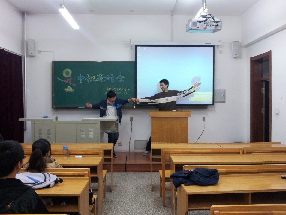 人多多,路茫茫,回家归途太漫长,星闪闪,月圆圆中秋中秋大团圆。伴随阵阵欢声笑语,1028101,1028201班的同学纷纷就坐茶话会会场。茶话会开始,班长先对本次班级活动做了简单介绍,并风趣的讲述了开学以来班级里发生的各种“糗事”。随后,茶话会正式开始,每位同学分别上台讲述自己假期里的趣闻趣事,分享最近的读书心得,以及刚刚进入大三对自己人生的规划。来自天津的同学在大家发言之后表演了一段精彩的相声。最后同学们一起欣赏了抗日题材幽默电影《举起手来2》。大家吃着学院为同学们准备的月饼,在一片欢乐中结束了本次中秋茶话会。