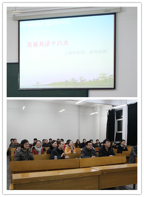 为学习十八大精神,弘扬爱国主义传统,响应学校关于开展学习十八大会议精神的号召,12月19日晚,生命学院12级硕士团支部在诚意楼114举办了主题为“青春共话十八大――做好科研、服务社会、报效祖国”的主题活动。生命学院2012级全体硕士研究生参与了此次活动。