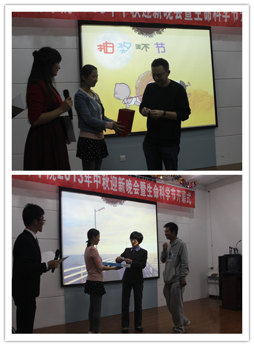 节目中间还穿插着游戏和抽奖环节,场下老师和同学积极参与到游戏环节中。最后,全场齐唱《为生命喝彩》,晚会在歌声中结束,2013年生命科学节正式启动。