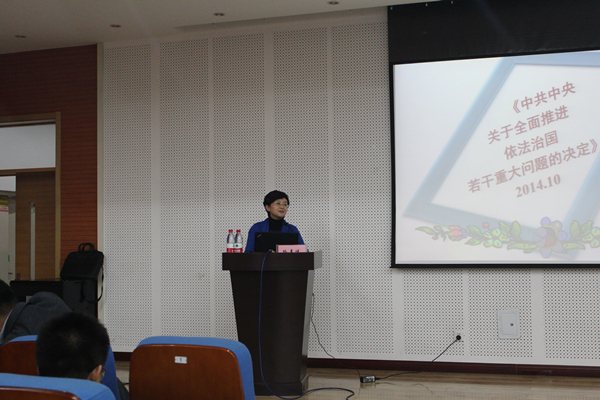 5月14日,学院开展了春季学期第二次学院集体学习活动,主题是十八届四中全会――依法治国的理论和政策学习,学院全体教师和全体学生党员参加了学习。马克思主义学院徐奉臻教授为大家作报告。党委副书记喻庆勇主持了学习活动。
