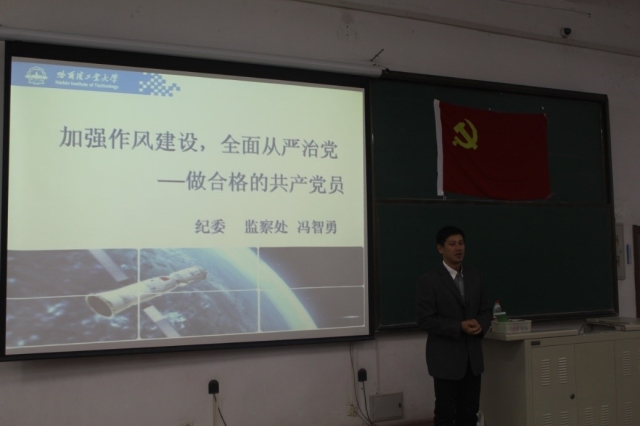 2016年11月8日晚18:30,中共哈尔滨工业大学党校生命—理学—化工与化学学院分校预备党员培训班第五讲在正心楼11教室顺利举行。本次党课的主题是《加强作风建设,全面从严治党——做合格的共产党员》,由纪委监察处冯智勇老师主讲。