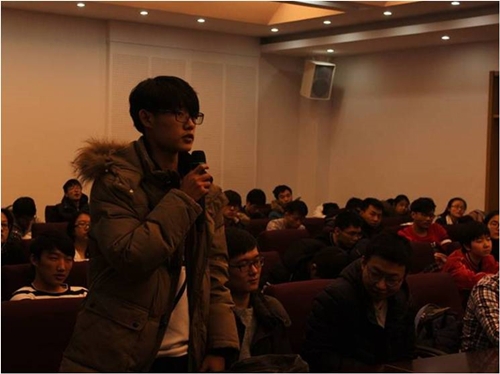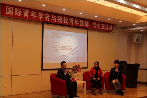 李文涛博士主要的研究方向为DNA损伤与修复以及环境致癌物,目前就职于美国Aziz Sancar教授实验室。Aziz Sancar现任美国北卡罗莱纳大学医学院教授,他凭借“DNA修复机制”的研究成果,成为2015年诺贝尔化学奖的获得者。访谈中,李博士首先简单介绍了自己的求学及工作经历,讲解诙谐幽默,使在场师生对于李博士及诺奖实验室情况有了初步的了解。随后是访谈环节,主持人提问,李文涛博士一一作答,让老师、同学们对李文涛博士求学、工作经历以及一流实验室的特色和风格有了更深入的认识。最后在现场师生提问环节中,李博士对于在国外的日常生活、出国求学动机、中美教育方式与文化差异等问题耐心讲解,分享了在外刊撰写、学业规划等方面的经验与感悟。