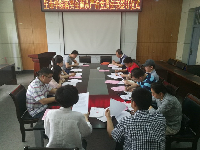 为严格落实全面从严治党主体责任,加强对学院党委对基层党支部的指导和监督,6月16日,生命科学与技术学院在科学园405会议室举行落实全面从严治党责任书签订仪式。仪式由党委副书记喻庆勇主持,生命学院党委书记李钰、党委委员和基层党支部书记(负责人)参加。