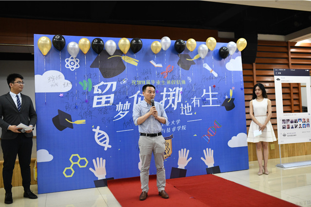 毕业生们在优美的音乐与毕业寄语中,依次走过红毯,在展板上留下签名,并合影留念。随后黄志伟教授代表全院教师致辞,感谢大家对学院工作的支持,又结合自己当年毕业的感受,希望大家毕业之后可以与自己的导师多多联系,分享喜悦,解决困难,最后黄老师祝贺广大毕业生们圆满完成学业,顺利毕业。