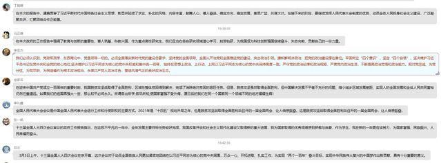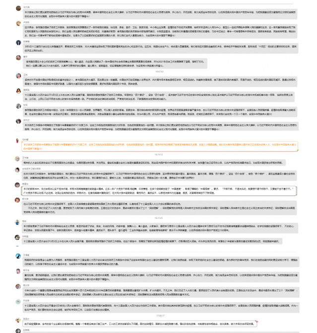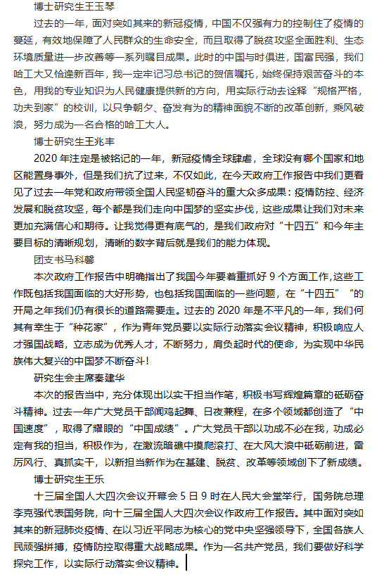 会议结束之后,同学们一致认为,政府工作报告坚持以习近平新时代中国特色社会主义思想为指导,充分体现了以人民为中心的发展思想,通过聆听李克强总理的报告,一幅中国发展新图景徐徐铺展在世界面前,也展现出中国坚定迈向高质量发展、满足人民新期待的自信。同学们纷纷表示:新百年、新征程,作为青年学生,将深入学习两会精神,坚定理想信念,练就过硬本领,投身强国伟业,将个人理想融入祖国发展的历史进程,为中华民族的伟大复兴做出更大的贡献!