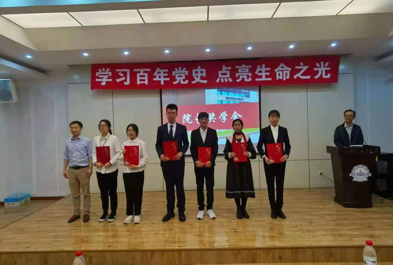党委副书记张勇老师宣读表彰决定,院长黄志伟教授为第一届院长奖学金获得者林智滢、张宗玮、张晋玮、熊杨杰、李尔卓、梁胜剑6名同学颁发证书,鼓励学生再接再厉,勇攀高峰。