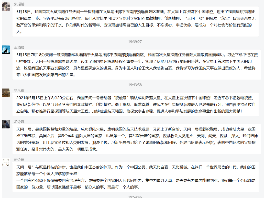 5月16日生命学院团委组织各团支部自发观看视频学习,结合工大团队在此次任务中的卓越贡献并学习感悟航天精神,发表了个人感想(节选)。
