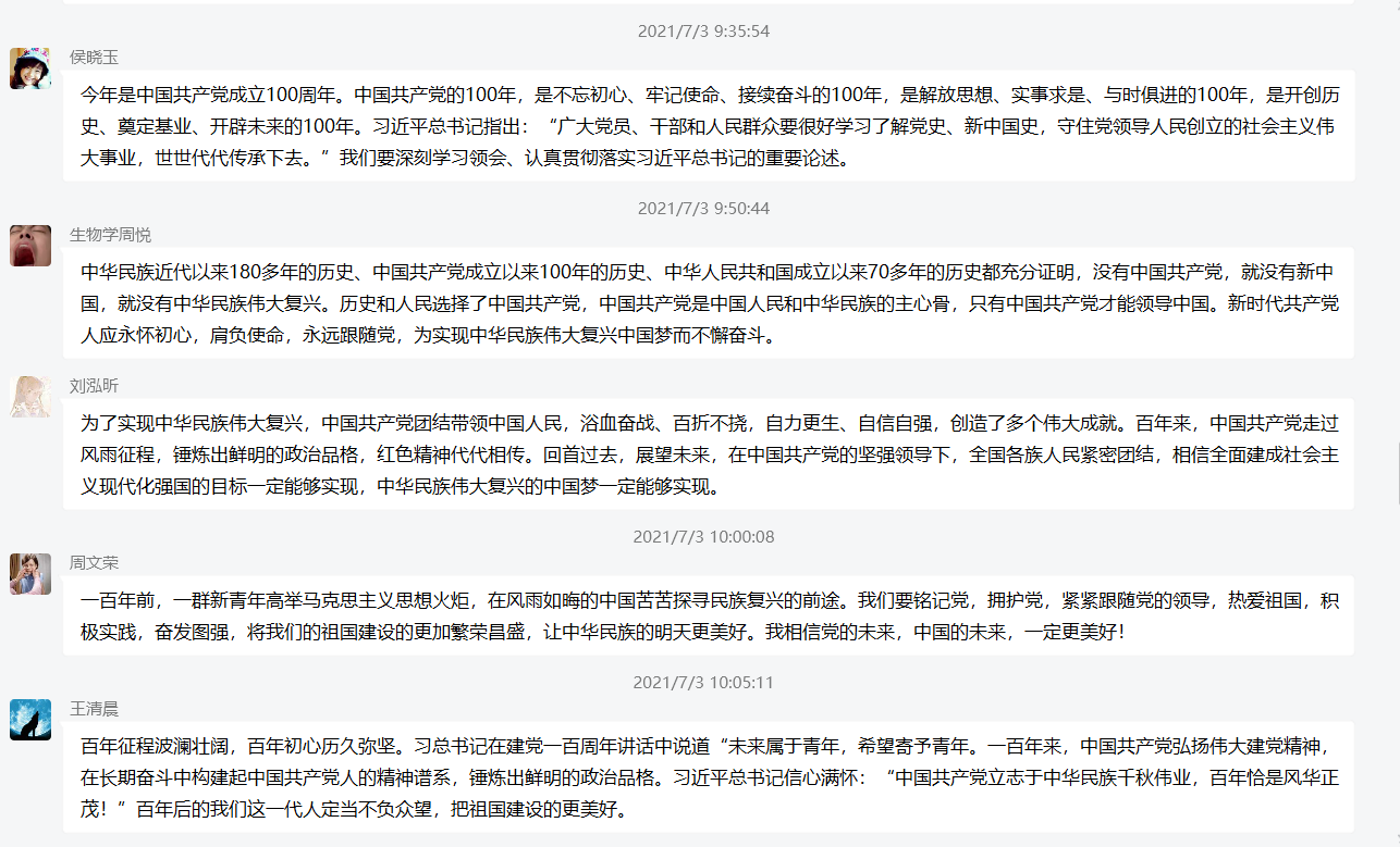 2021年7月1日,习近平总书记在建党100周年大会上发布重要讲话,鼓舞激励着广大中华儿女。生命学院团委组织各党支部成员在线学习习近平总书记在庆祝大会上的重要讲话,并结合各自的学习生活和工作实际在观看后于团支部群里发表了学习感想,并对重要讲话精神进行交流探讨。