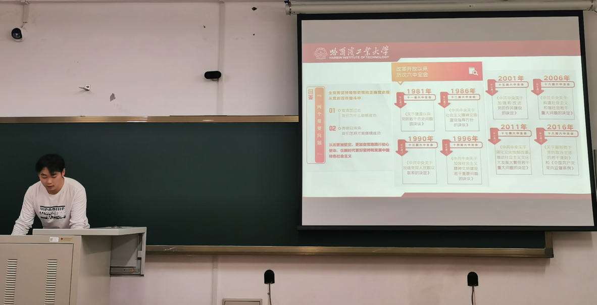 活动最后总结了中国共产党第三个历史决议的内涵。第一,决议是一篇马克思主义的纲领性文献;第二,决议是新时代中国共产党人牢记初心使命,坚持和发展中国特色社会主义的政治宣言;第三,决议是以史为鉴,开创未来,实现中华民族伟大复兴的行动指南。本次活动使同学们深刻领会了十九届六中全会的精神内涵,坚定个人理想与国家命运相结合的信念。正值建党百年与哈工大新百年新征程,青年学生应当坚持怀有奋斗精神,时刻提升自己,在时代的潮流中书写下属于自己的篇章。