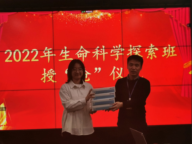 生命科学探索班实行全覆盖导师制,对学生进行个性化指导,经过一学期的实验室创新轮转,确定科研方向。本次已确定导师的学生与老师现场签订培养协议,学生在探索生命科学奥秘的道路上扬帆起航。院长黄志伟教授、副院长胡颖教授、张立辉老师为入选生命科学探索班(本博连读)的高文博等11名探索班学生颁发价值6000元的移液枪或数据处理终端,鼓励同学勇于探索,刻苦钻研。