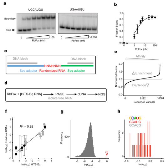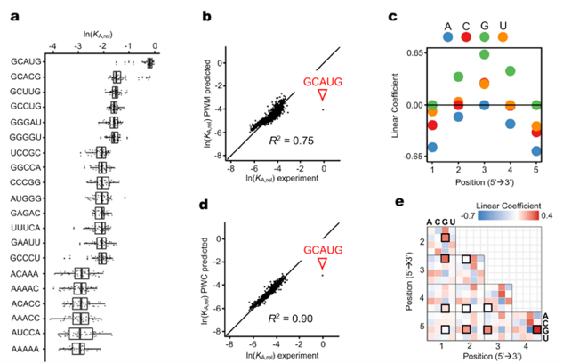 图1左:RbFox与所有7-mer RNA序列变体的亲和力检测;图1右:RbFox与RNA亲和力分布的定量分析。