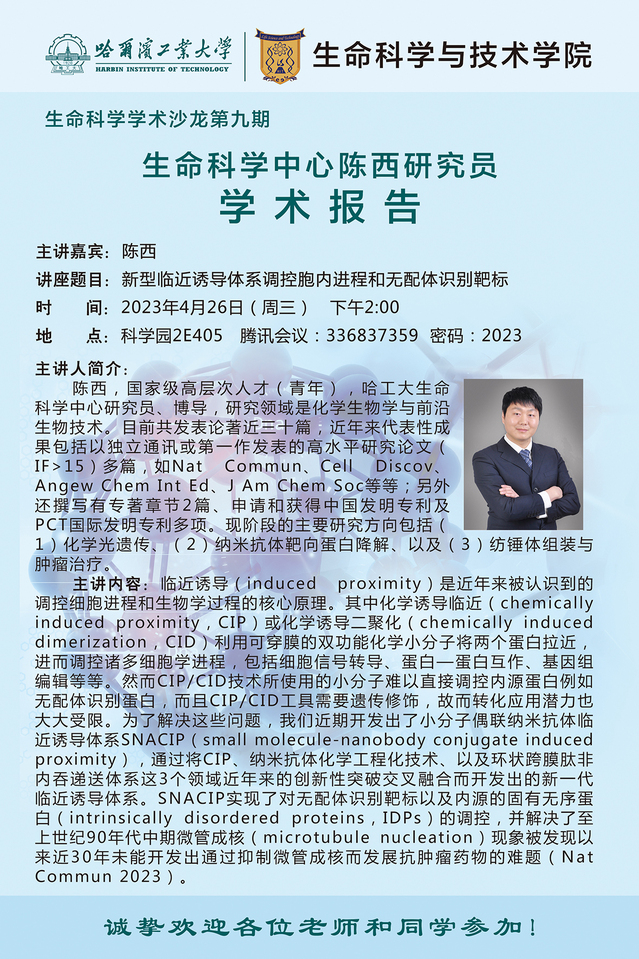 报告题目:新型临近诱导体系调控胞内进程和无配体识别靶标