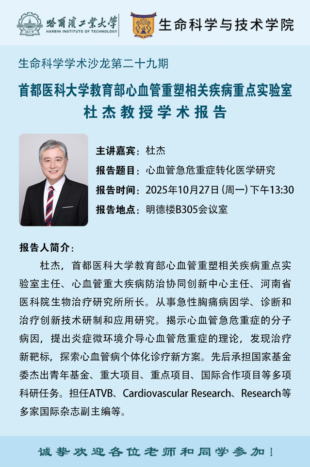 【生命科学学术沙龙第二十九期】首都医科大学教育部心血管重塑相关疾病重点实验室主任杜杰学术报告